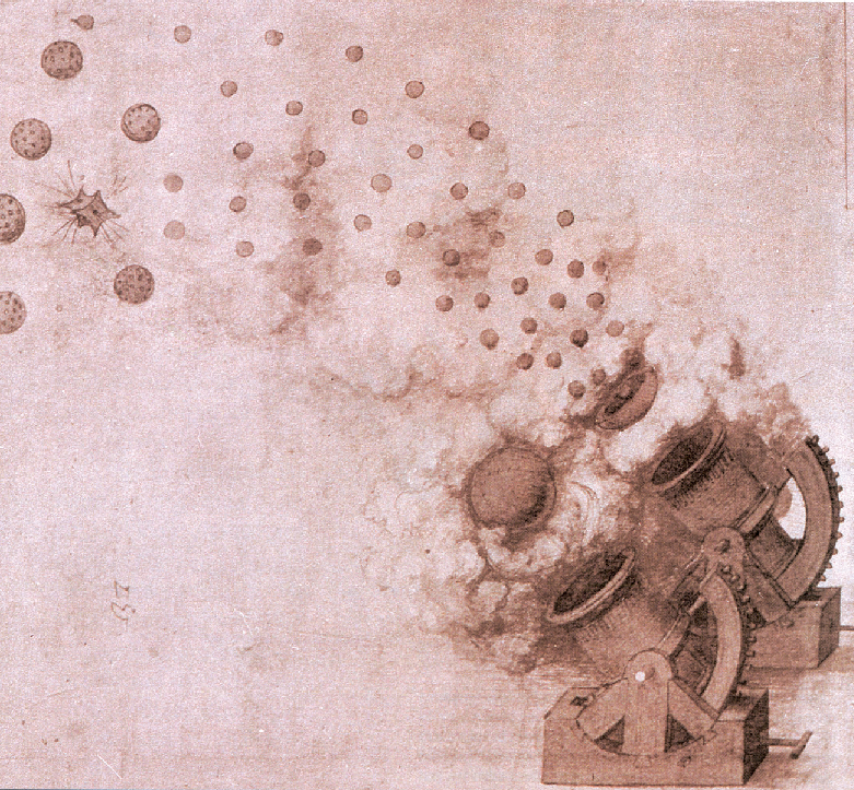 Había que intensificar el bombardeo, así que Da Vinci se dio a ala tarea de crear una arma grande de carcasas redondas, hierro y un cosido dentro de una cubierta flexible, al momento de explotar, este lo hacia en varios fragmentos, logrando así tener un mayor impacto a diferencia de un simple cañón que dispara una sola bala.